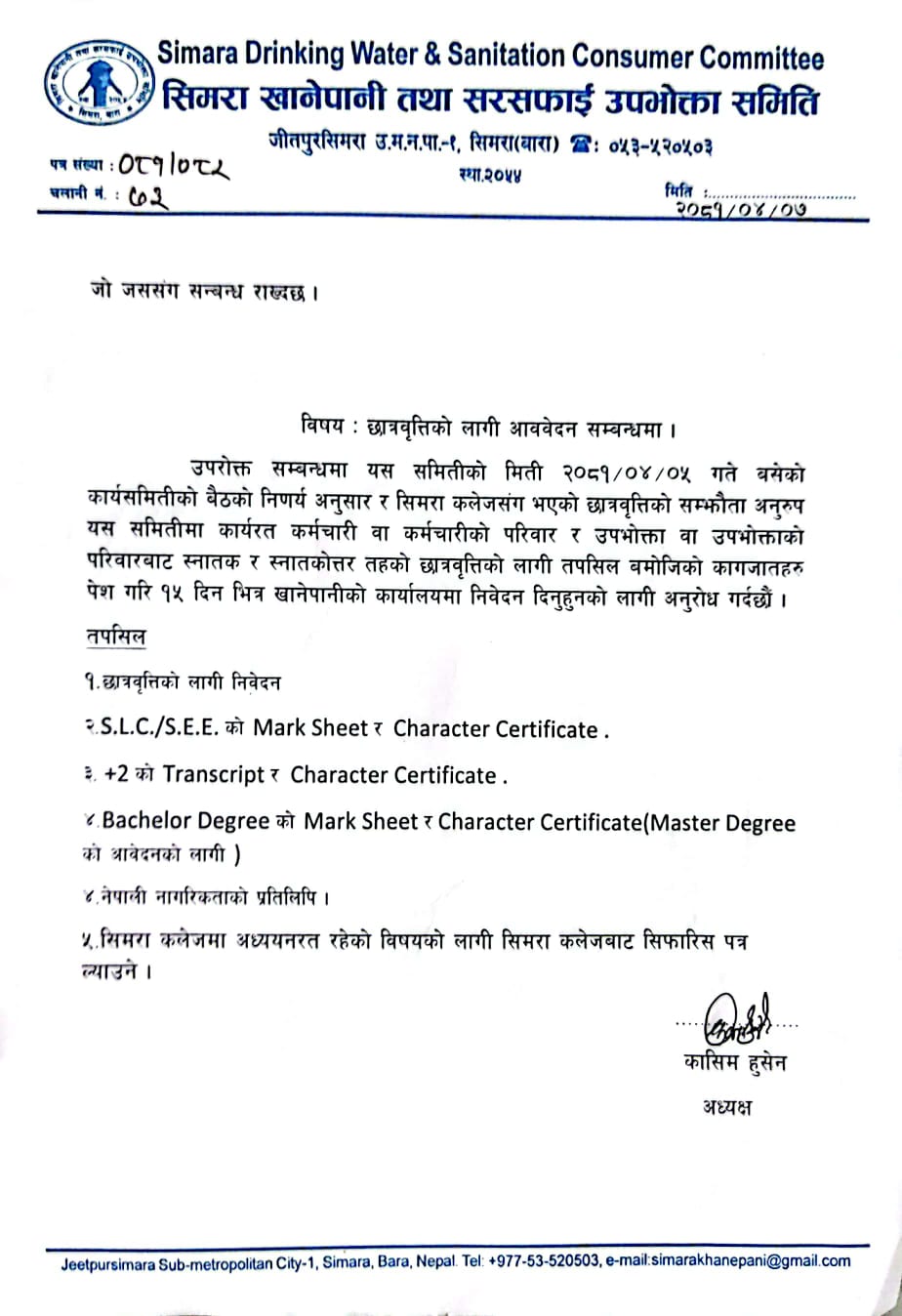 गत शनिबार बसेको कार्यसमितिको बैठकले सिमरा कलेजसँगको छात्रवृती सम्झौता अनुसार हुनेगरी १५ दिनभित्र छात्रवृतीका लागि दिवेदन माग गरेको छ ।